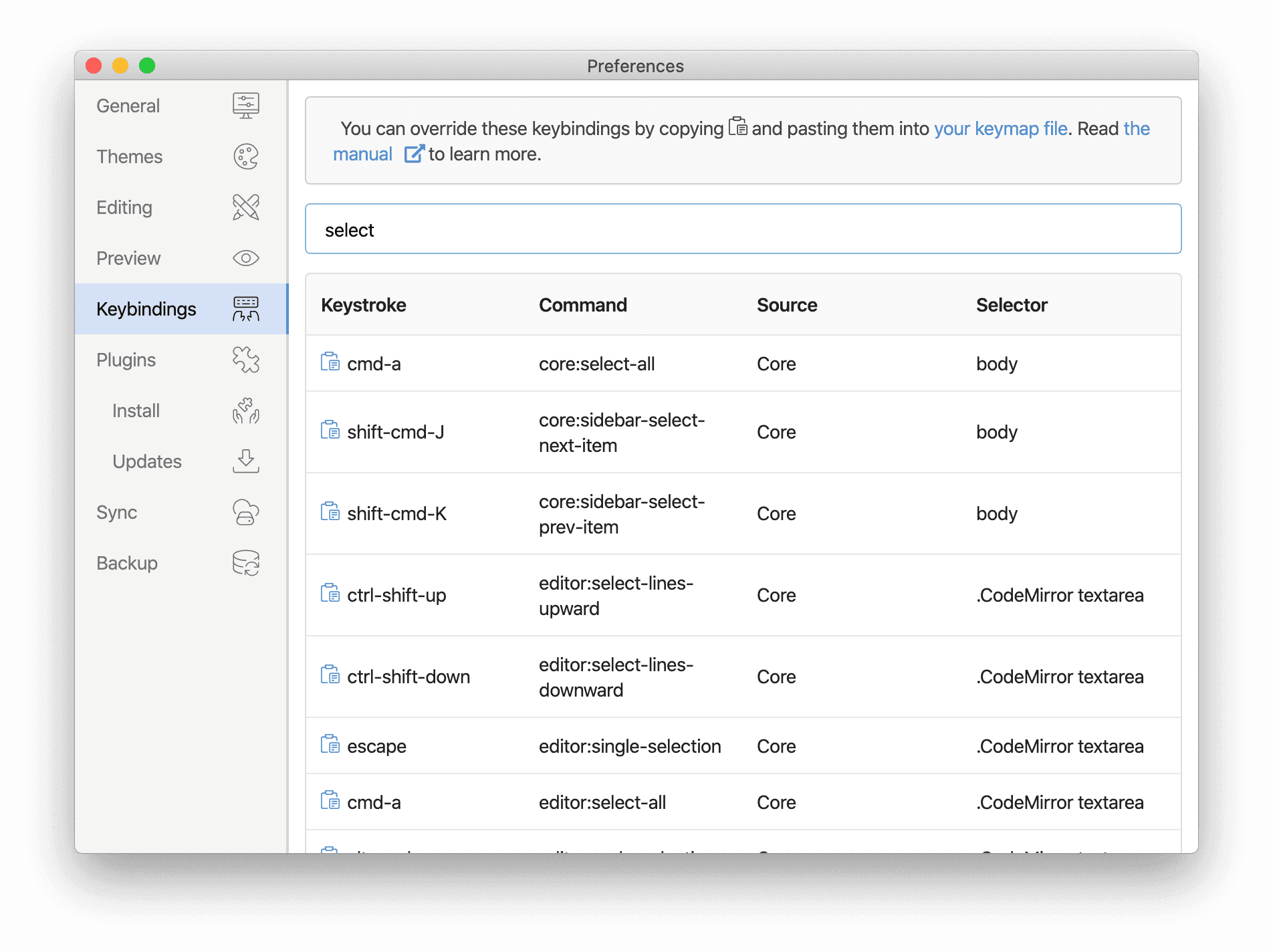 Inkdrop keymaps work similarly to stylesheets. Just as stylesheets use selectors to apply styles to elements, Inkdrop keymaps use selectors to associate key combinations with events in specific contexts. Here's a small example, excerpted from Inkdrop's built-in keymap: