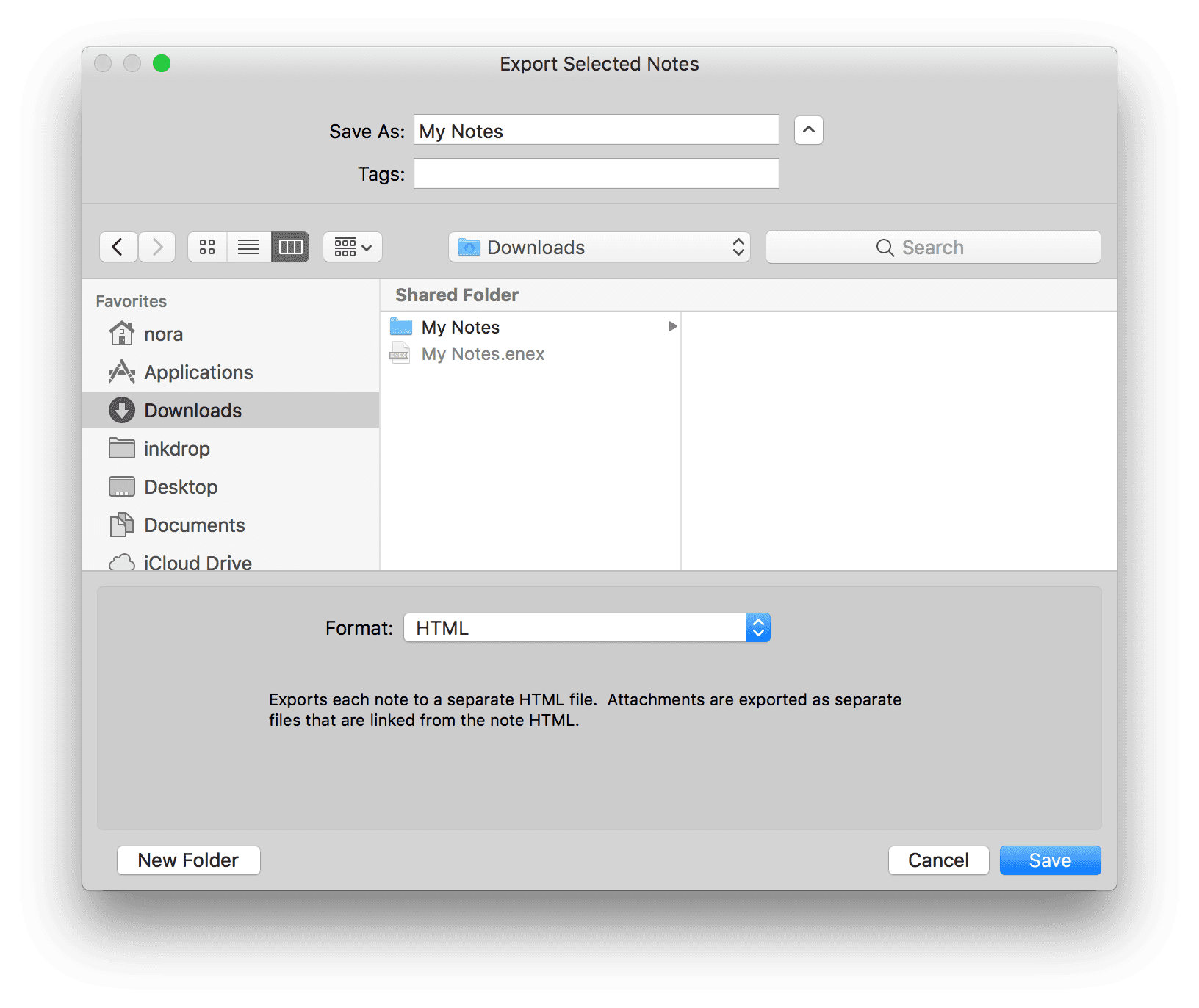 ‘Export Selected Notes’ dialog will show up. Please choose HTML as an output format, then click ‘Save’ button.