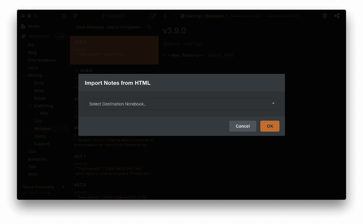 Now let’s import them. Select ‘Inkdrop -> Import -> from HTML files…’ from menu.