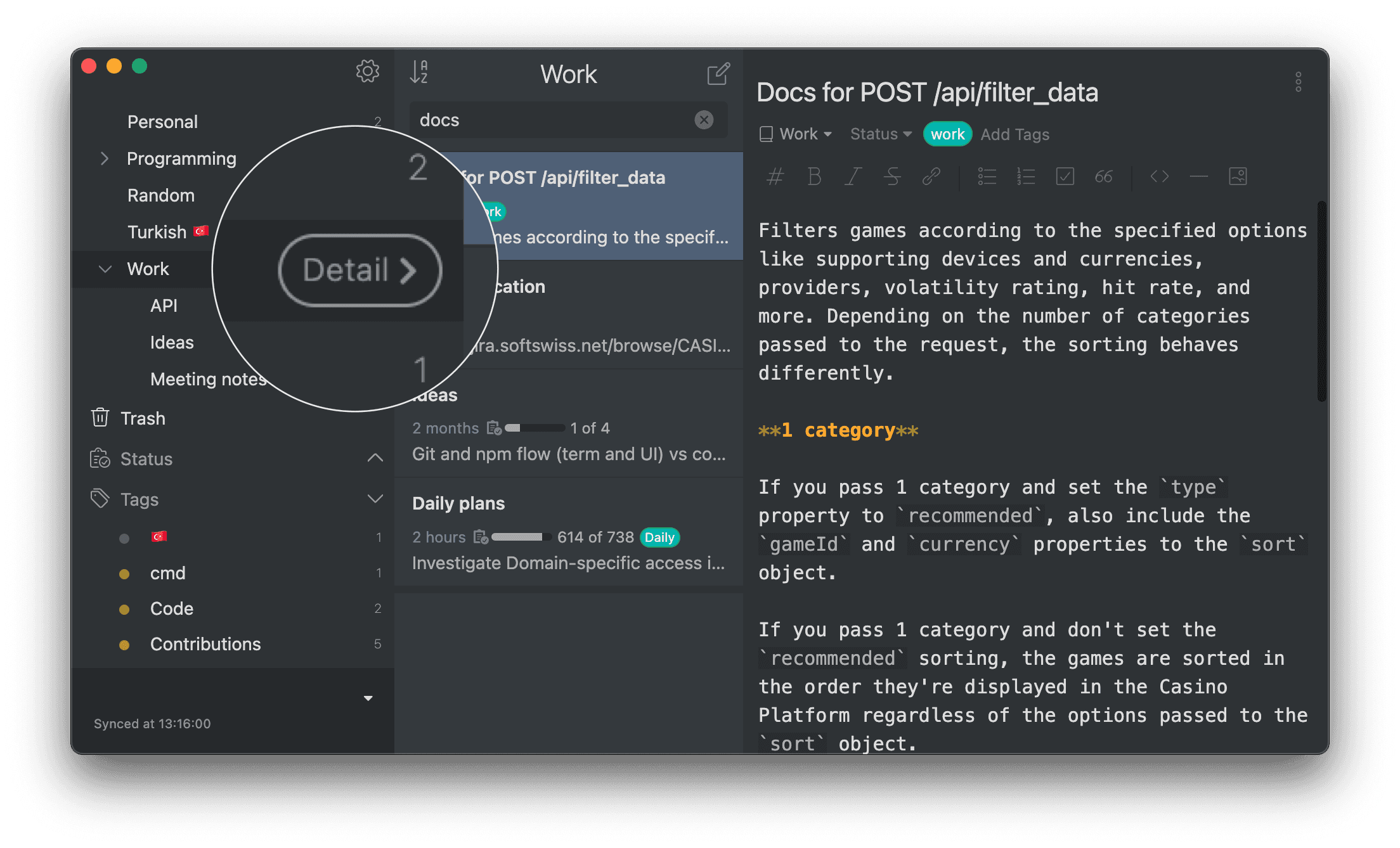 One of the ways to think about notebooks is like separate projects. Every notebook covers a specific topic and can be divided into sub-notebooks. Every (sub)notebook has a list of notes, and every note can have tags and statuses. When the number of notebooks or their content grows, notebooks management can become a nightmare.