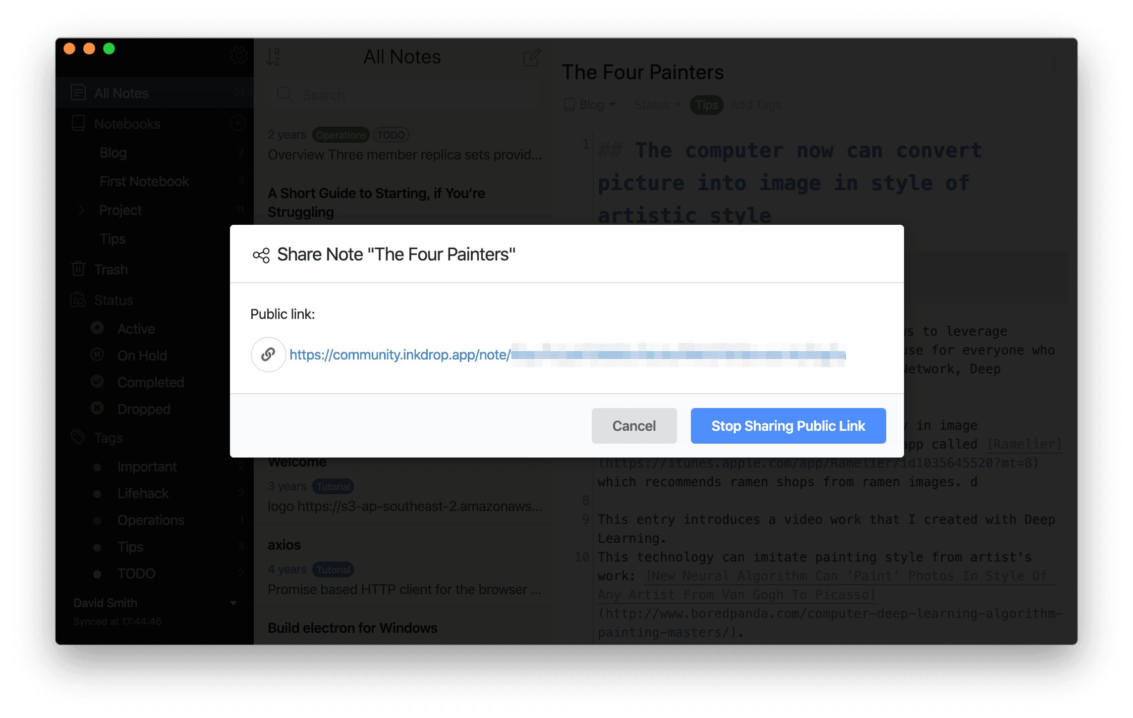 Publishing notes on the web comes in handy if you are working on a team project or just passing along useful tips to friends. It allows you to share your Markdown notes with anyone, even those who don't use Inkdrop.